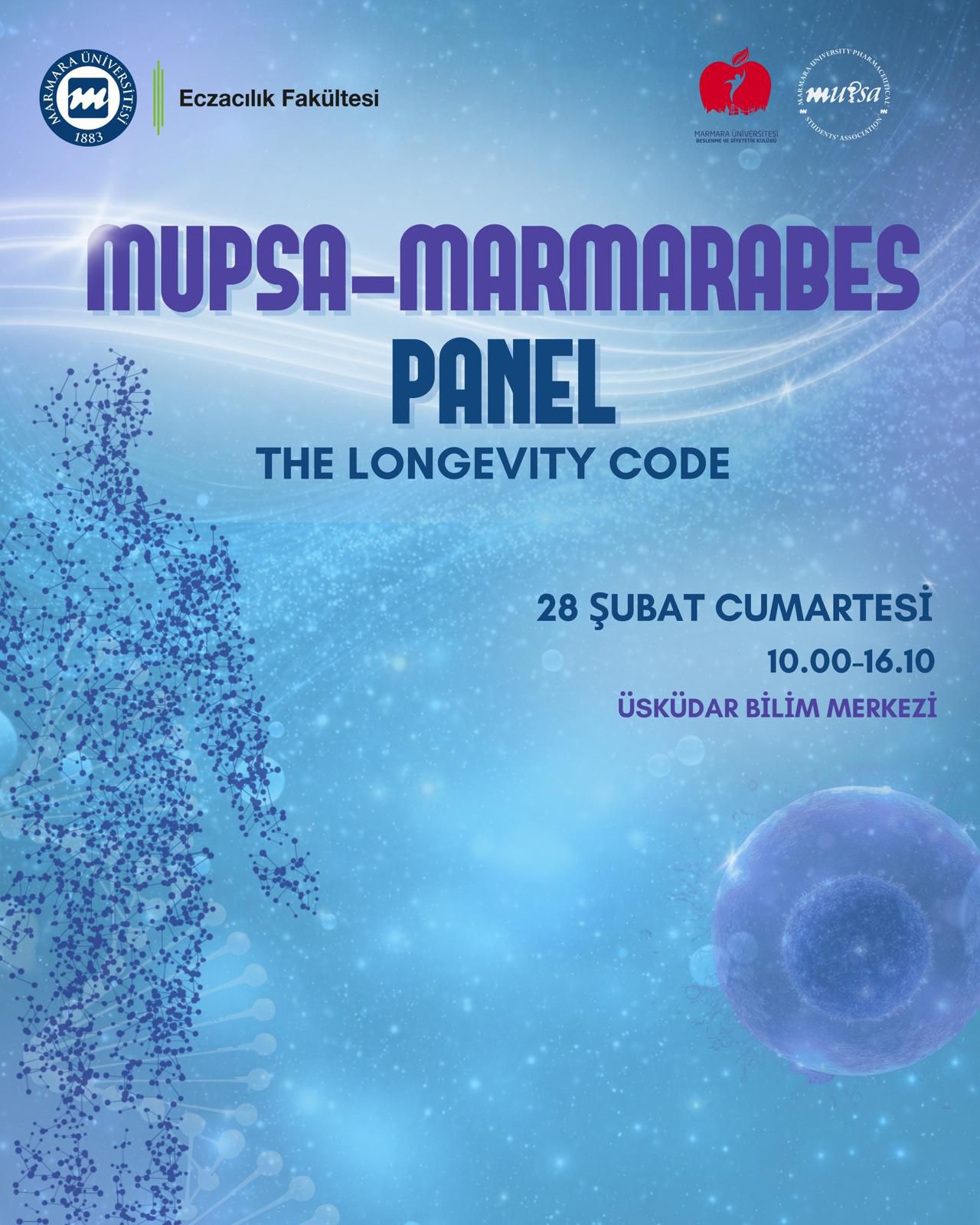 Marmara Üniversitesi Beslenme ve Diyetetik Kulübü (MarmaraBES) ve Marmara Üniversitesi Eczacılık Öğrencileri Birliği (MUPSA) iş birliğiyle düzenlenen The Longevity Code panelinde, uzun ve sağlıklı bir yaşamın arkasındaki bilimsel gerçekleri keşfetmeye hazır mısınız? 🧠